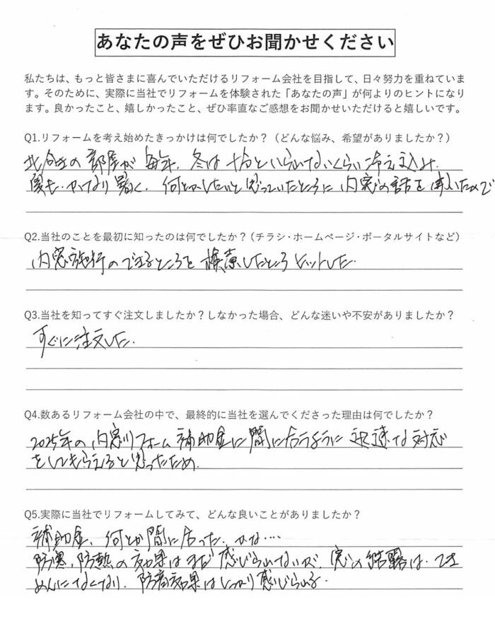 2025年の内窓リフォーム補助金(先進的窓リノベ2025事業)に間に合うように迅速な対応をしてもらえると思ったため。