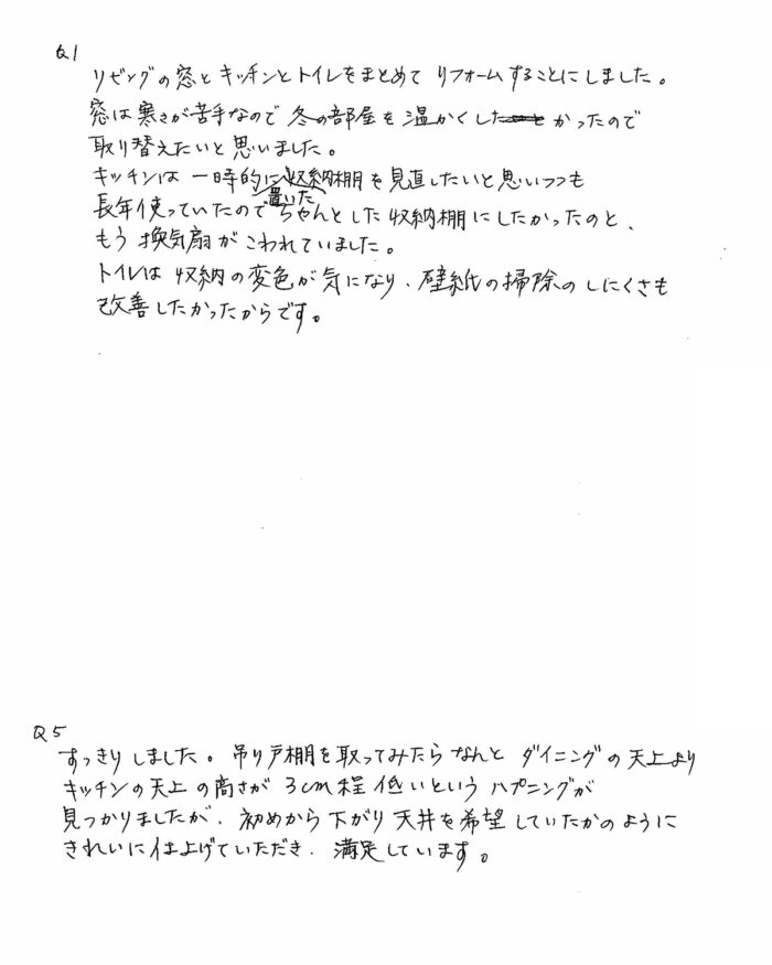 窓のリフォームでペアガラス(外窓交換)を選んだので、部屋が温かくなった上に外の音が入りづらくなりました。室内の音も漏れづらくなったのではと思います。キッチンは使っていなかった吊り戸棚を取り外してすっきりしました。吊り戸棚を取ってみたらなんとダイニングの天井よりキッチンの天井の高さが3cm程低いというハプニングが見つかりましたが、初めから下がり天井を希望していたかのようにきれいに仕上げていただき、満足しています。