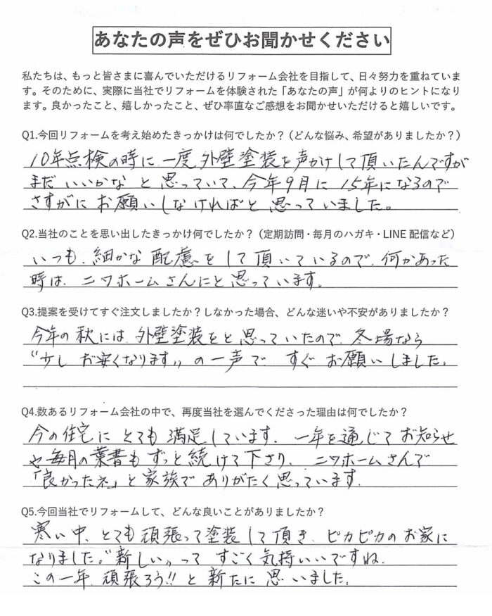 今年の秋には外壁塗装をと思っていたので、冬場なら“少しお安くなります”の一声ですぐお願いしました。