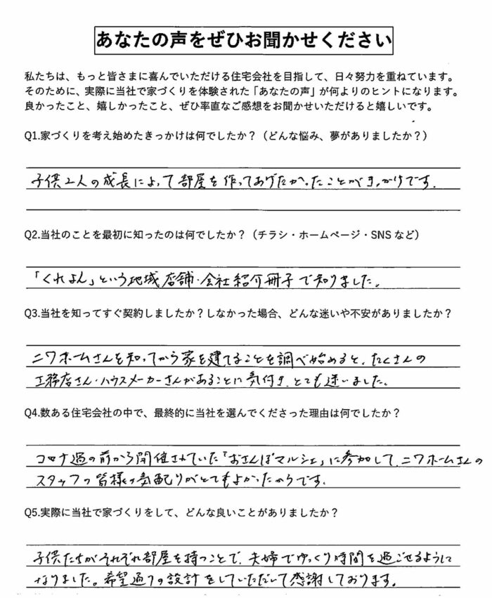 子どもたちがそれぞれの部屋を持つことで、夫婦でゆっくり時間を過ごせるようになりました。希望通りの設計をしていただけて感謝しております。