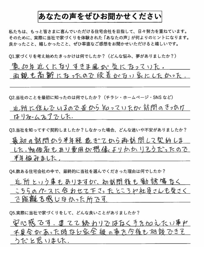 築50年近くになり、すきま風が気になっていた。両親も高齢になったので、段差がない家にしたかった。